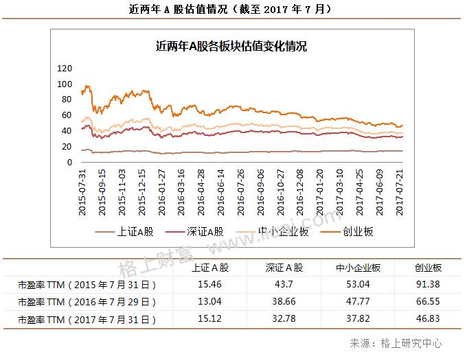 格上研究中心统计结果显示,7月各大板块估值较前期均有较大幅度下降,市场逐渐理性,估值向合理区域回归。对比过去两年A股各板块市盈率变化情况,上证A股市盈率降幅较小,创业板降幅最大。