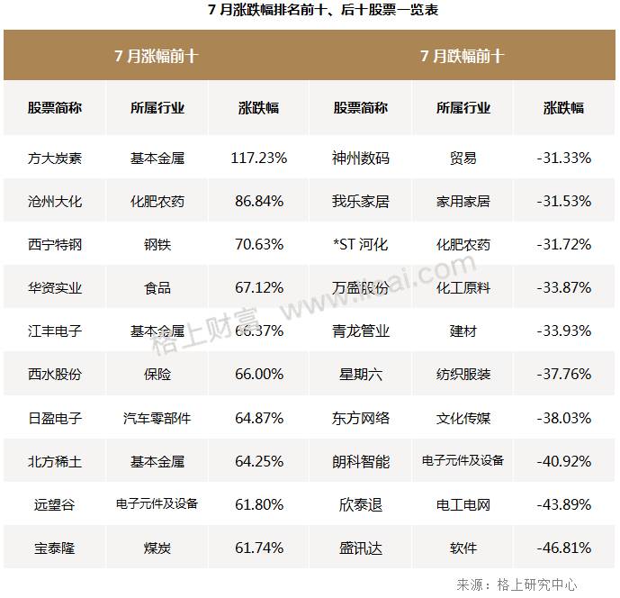 格上研究中心统计结果显示,7月申万一级28个行业中,14个板块出现不同程度的上涨。有色金属涨幅最大,上涨20.56%;钢铁和采掘紧跟其后,分别上涨16.23%和8.07%。其他涨幅超过3%的板块有:化工、银行、非银金融,分别上涨5.56%、5.36%和4.14%。跌幅较大的板块有:医药生物、计算机、传媒、公用事业,分别下跌4.75%、4.75%、4.7%和4.25%。有色金属板块,方大炭素涨幅最大,上涨117%,北方稀土和江丰电子上涨超过60%。钢铁板块,西宁特钢上涨70.6%,*ST华菱和方大特钢上涨超40%。