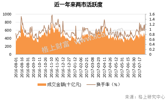 格上研究中心统计结果显示,7月市场活跃度整体上呈上升的态势。从数据上来看,上月两市日均成交额为3834.5亿元,日均换手率为0.77%。本月两市日均成交额4629.8亿元,较上月上升20.74%;日均换手率为0.97%,较上月提升0.2个百分点。