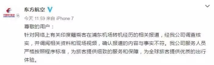 对此,中国东航回应称,针对网络上有关印度籍乘客在浦东机场转机经历的相关报道,经我公司调查核实,并调阅相关资料和现场视频,确认报道的内容与事实不符。我公司服务人员严格按照程序标准,为旅客提供细致的服务和保障,为全球旅客提供优质的出行体验。