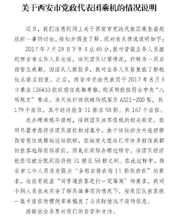 8月12日中午,@中国南方航空 发布《关于西安市党政代表团乘机的情况说明》,称西安方面并未提出“前11排座位”和“隔离普通旅客”的要求,是个别人员在未完全了解事实的情况下,草率编发了不实信息。