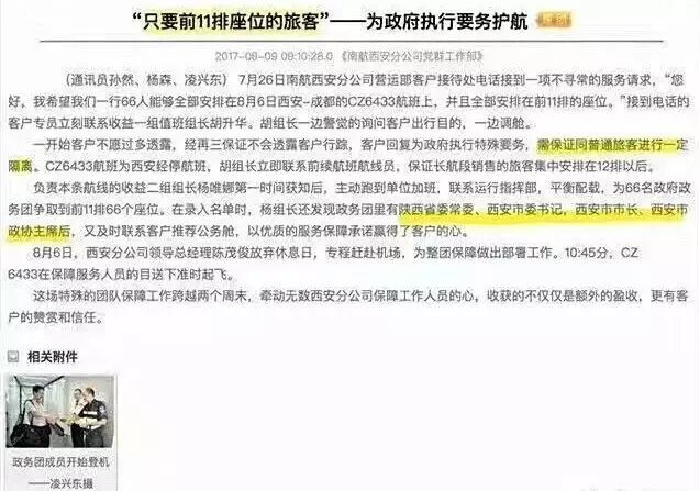 文章表示,“政务团”提出要求,“全部安排在前11排的座位,并与普通旅客进行一定隔离”,而南航在接到电话后,紧急出动,终于圆满完成了任务。