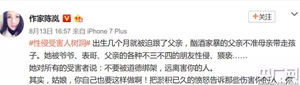 如今,陈岚已经整理数千条#性侵受害人树洞#的微博私信,收到网友的一排排长文中,100%都是熟人作案,侵犯人甚至包括外公、爷爷、伯父等,案件细节令人发指。“十几岁开始,就被大半岁的表哥强奸近十几次…….还有的妈妈在听到女儿投诉,被继父性骚扰后反而大骂女儿。多年后女儿旧事重提,居然怪女儿记仇,还让女儿给做他爱吃的饭菜 ……”