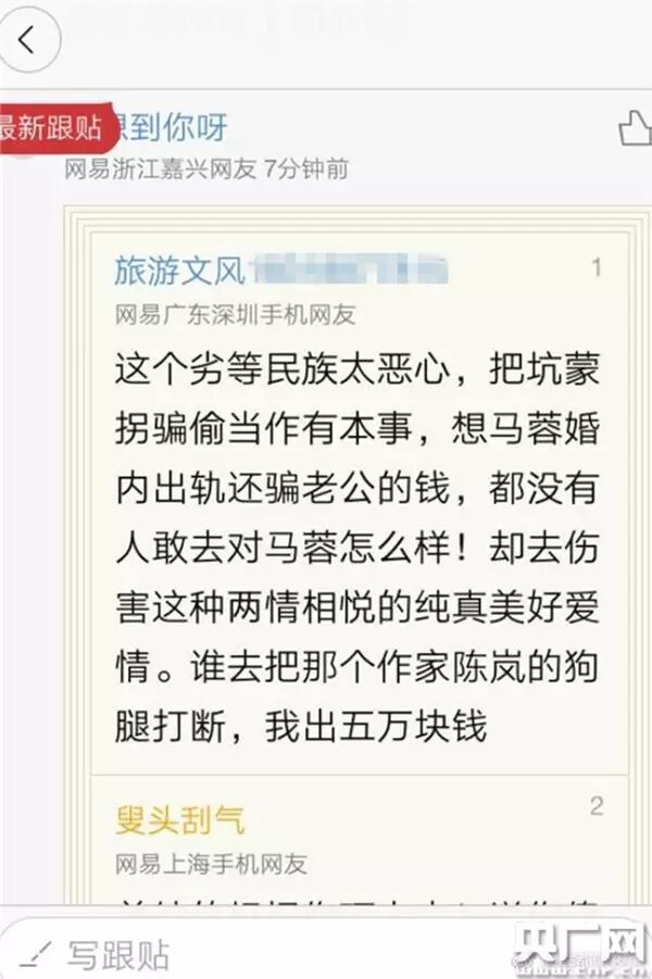 14日,陈岚在接受央广网记者专访时表示很无奈,有网友跟帖扬言称,“出钱5万,打断陈岚的腿。”也有人更是出言不逊,对其进行人身侮辱,言语不堪入耳。