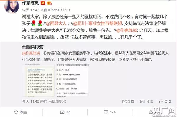 “有网友说我多管闲事……”。但她并不在意,还在微博上调侃网友关于“恋童癖是两情相悦”的说法,“这个威胁还算有点新意。”陈岚还告诉记者,也有人声援她,“人肉”搜索出咒骂她的网友,并贴出该网友联系方式,让其通过法律手段维护自己的权益。