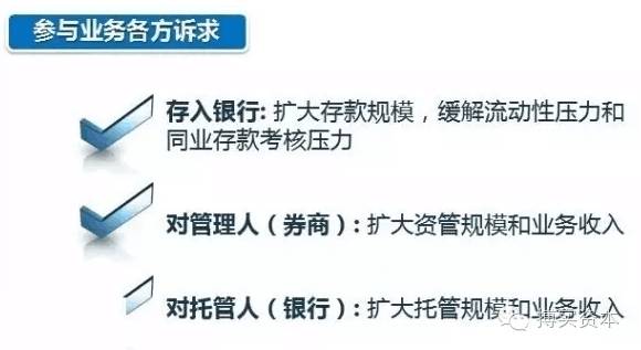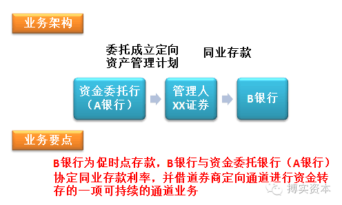 A银行在月末用资金参与一天定向计划,借道券商资管定向通道存入B银行,银行双方约定同业存款利息。第二天,定向计划结束。资金回到委托行。此业务能为银行同业时点存款考核提供便利,也促进了券商和银行之间的合作关系,有效积累资源。