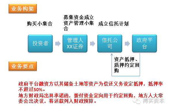 ·通过发起若干小集合资产管理计划募集资金,用于购买表内信托计划,受让某政府平台金融资产(债权、应收账款等),并由该政府平台到期约定回购。当出现未能按时回购的违约风险时,该政府平台金融资产收益权产生的现金流可作为还本付息保证。政府平台以其可处置资产作为偿还抵押,抵押率不超过50%。