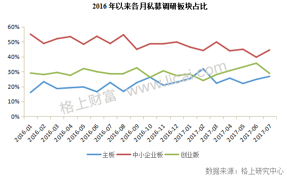 7月份创业板表现不佳,同时私募对创业板的关注度也结束了之前持续上涨的趋势,迅速回落至28.79%,较6月份环比下降19.11%。和各大指数表现一致,私募机构对主板和中小板的关注度都有着不同程度的上涨,其中主板关注度上涨至26.77%,中小板关注度上涨4.9个百分点,达44.44%。