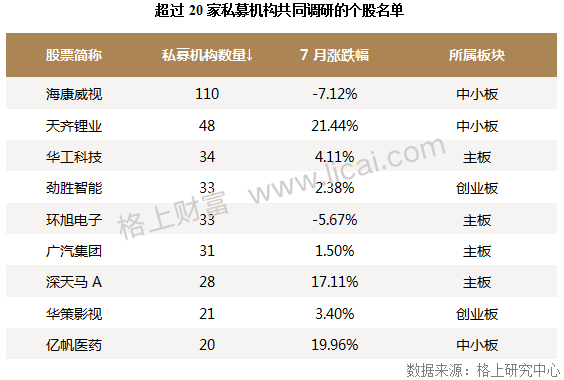 私募机构调研抱团现象依旧明显,有9家上市公司获得超过20家私募机构的共同关注。其中天齐锂业涨幅最大,7月总共上涨21.44%。在超过20家私募机构调研的个股名单中,各个板块分布出现分化,其中主板4家,中小板3家,创业板则只有2家。超过20家私募机构调研的个股7月份平均收益为6.35%,好于同期各大市场指数。