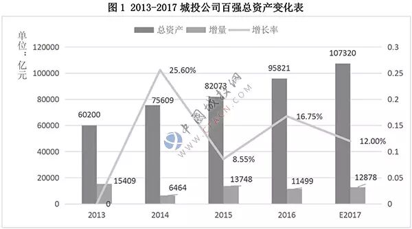 据2016年全国城投百强资产排名榜报告分析,2016年中国城投公司百强的总资产规模达到95821亿元,平均资产规模958亿元。其中资产总额在均值之上的城投公司共26家,总资产为51195亿元,占百强总资产的53.43%;资产总额在均值之下的城投公司共计74家,总资产为44626,占百强总资产的46.57%。对比2015年的城投百强榜单,总资产比去年增加了13748亿元,比2013年总资产增加了35621亿元,平均每年资产增长率达到16.97%。假设以16%的资产增长率计算,预计到2017年我国城投公司百强总资产规模能突破11万亿元。2013至2014年,我国的城投公司资产增速非常快,2014年资产规模增速将近25.60%,至2015年锐减至8.55%,相对于2015年的增长率来看,2016年的城投公司资产规模有较大的增幅,达到了16.75%,主要原因在于43号文之后,城投公司都在积极进行进入深化改革和转型突破,预计这个阶段城投百强总资产增速将保持在12%增长的平稳状态。