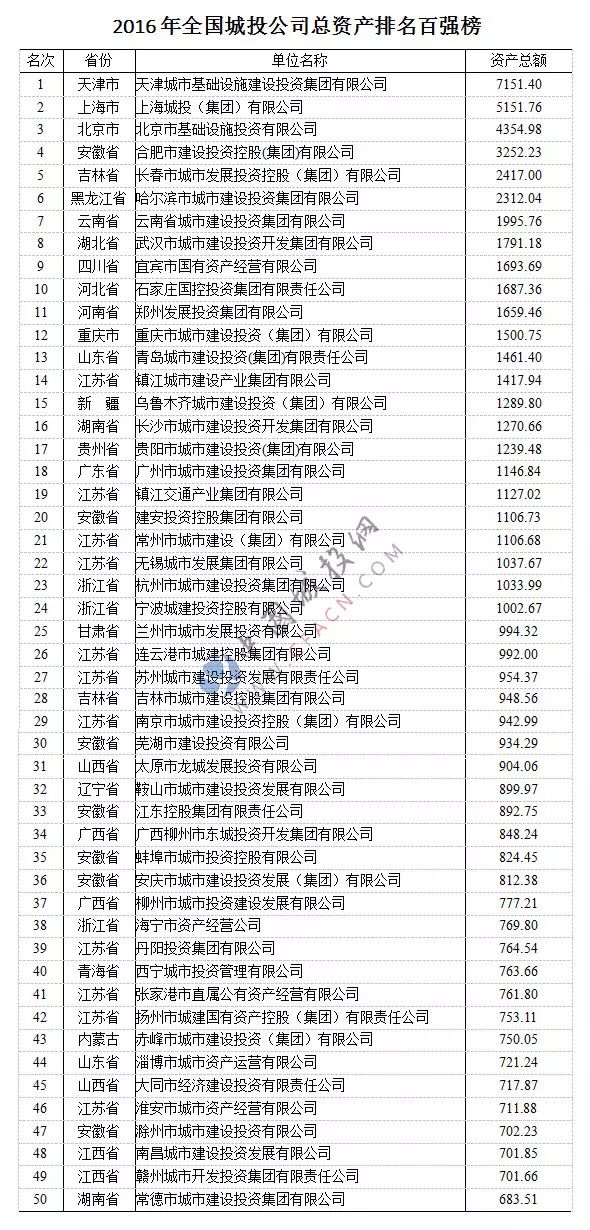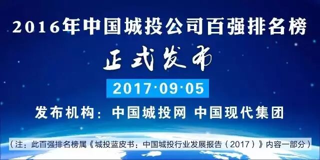 2017年9月5日,由中国城投网和中国现代集团组织的“城投公司百强榜单发布会暨转型研讨会”在北京举办,中国城投公司百强(总资产)排名榜在会上正式出炉。
