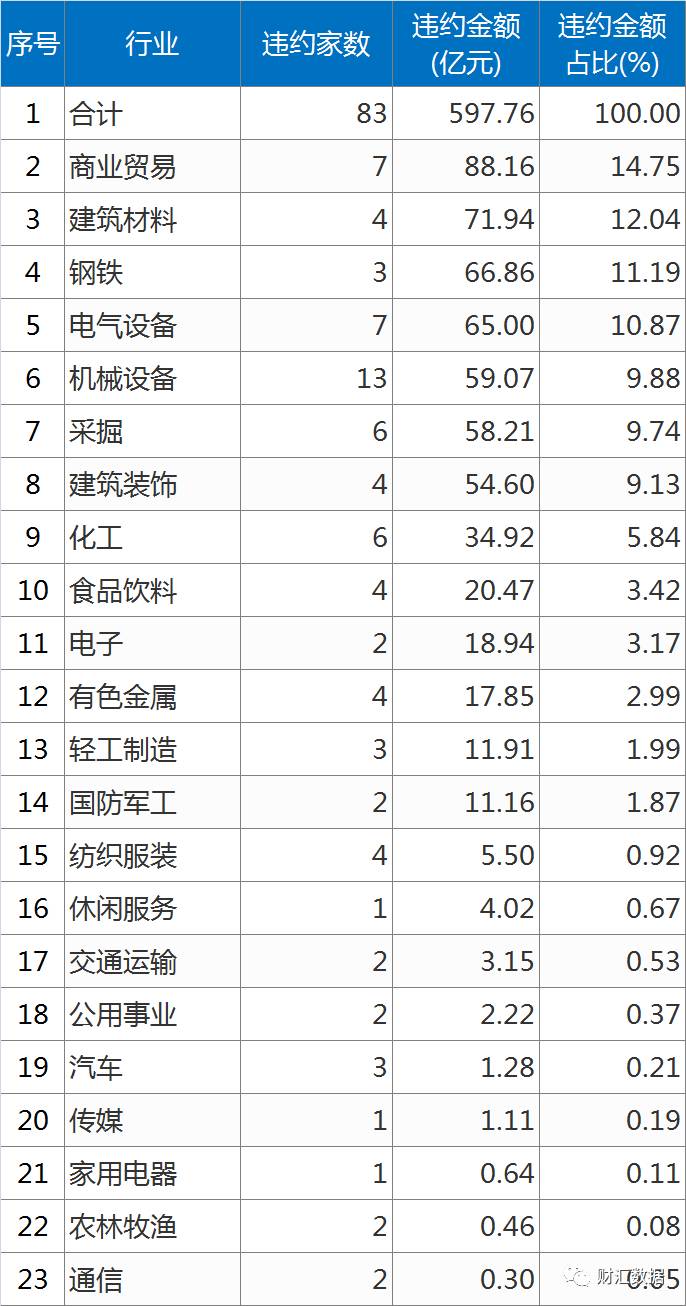 根据财汇金融大数据终端统计,截止2017年8月31日,违约债券数量共计148只,涉及违约主体83家,累计违约金额597.76亿元。