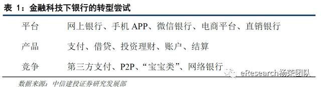 在新兴互联网技术的冲击下,传统金融机构加快转型步伐,从平台、产品、内部管理和经营策略等方面都进行了重要调整,行业已迎来了新一轮的金融科技革命。在过去,传统银行或许还能将互联网作为业务和渠道的补充,填补其服务长尾客户的空白。但今天看来,数字渠道将逐渐成为客户的首选,竞争者将利用互联网不断推进资金端和资产端业务的创新,推动金融交易的全面互联网化。上市银行普遍高度重视互联网金融业务,传统银行正逐步变革其运营模式,实现业务流程线上化,金融服务场景化和运营模式化繁为简。 尽管互联网金融不断冲击传统银行的方方面面,但传统商业银行拥有庞大的用户群体,资金雄厚,业务复制能力强。目前在互联网金融领域的发力各家银行各有特色,如招商银行以网上商城等电商平台为特色的电子银行渠道类产品、平安银行被认为是年轻人的时尚互联网银行的直销银行橙子银行、浦发银行的浦发金融大超市将传统的电商业务与金融产品相结合、兴业银行带有独特功能的手机银行等。 银行在金融科技大趋势下的转型尝试从形式来看,其平台可分为网上银行、手机APP、微信银行等电子渠道,以及电商平台、直销银行等聚焦特色场景、搭建开放式统一的互联网金融综合服务平台。而从转型内容来看,其产品分为支付、借贷、投资理财、账户、结算等服务不同金融需求。与之对应的是同样伴随着金融科技兴起的竞业产品,如第三方支付、P2P、“宝宝类”、网络银行等。 电子渠道 目前商业银行形成的是以网银支付为基础,移动支付为主力,电话支付、自助终端、微信银行等多种电子渠道为辅助的电子银行业务结构。 传统商业银行的本质在于存、贷、汇,银行最初的转型实践是建立各自的网上银行系统,利用官方网站开展业务,使其业务由部分到全部迁移至网络的演变过程。其效用在于利用互联网的技术提高银行的效率,建立多维度的客户关系。与此同时,电话银行、手机银行也应运而生,人们可以更加便捷的享受到银行的服务。 不过,在此过程中,人们的上网习惯也在快速发生变化,由PC端向移动端倾斜。于是,基于用户的需求,银行又纷纷推出自己的手机APP。但是很多消费者同时是多家银行的持卡用户,人们却不希望自己的手机里同时下载多家银行的手机APP。微信集成了多家银行的服务,在客户群中的高频使用适合银行进行推广和获客。自2013年起,招商银行、中国工商银行、中国建设银行等相继推出“微信银行”。 网上银行提供网上形式的传统银行业务,包括银行及相关金融信息的发布、客户的咨询投诉、账户的查询勾兑、申请和挂失以及在线缴费和转账功能。除此之外还包括新的金融创新业务,比如集团客户通过网上银行查询子公司的账户余额和交易信息,再签订多边协议。 个人理财助理是网上银行重点发展的一个服务品种。各大银行将传统银行业务中的理财助理转移到网上进行,通过网络为客户提供理财的各种解决方案,提供咨询建议,或者提供金融服务技术的援助,从而极大地扩大了商业银行的服务范围,并降低了相关的服务成本。 企业银行服务一般提供账户余额查询、交易记录查询、总账户与分账户管理、转账、在线支付各种费用、透支保护、储蓄账户与支票账户资金自动划拨、商业信用卡等服务,甚至包括投资服务等,部分网上银行还为企业提供网上贷款业务。 除了银行服务外,大型商业银行的网上银行均通过自身或与其他金融服务网站联合的方式,为客户提供多种金融服务产品,如保险、抵押和按揭等,以扩大网上银行的服务范围。 手机银行是网上银行的延伸,也是继网上银行、电话银行之后又一种方便银行用户的金融业务服务方式,有贴身“电子钱包”之称。它一方面延长了银行的服务时间,扩大了银行服务范围,另一方面无形地增加了许多银行经营业务网点,真正实现24小时全天候服务,大力拓展了银行的中间业务。 电商平台 电子商务相关业务,既包括商户对客户模式下的购物、订票、证券买卖等零售业务,也包括商户对商户模式下的网上采购等批发业务的网上结算,国有大行更热衷。电商服务平台后续将持续为各类初创和成熟电商提供更优更好的互联网金融服务,最终实现企业、用户、银行的三方共赢。 商业银行的电商平台创新路径主要为以下两大类: 一类是以工行融易购、建行善融商务等大型国有银行为代表的自建交易平台类。该模式通过商业银行自行搭建交易平台,吸引客户上来结算,再配套投融资业务。 另一类是以浦发“款道”、中信电子招投标系统、平安B2B电子商务收付款等商业银行为代表的跨行收单类。该模式主要以反接第三方支付打通跨行结算通道,以交易平台开立真实银行结算或资金监管账户进行交易资金存放,为交易主体在该真实银行账户下开立虚拟子账户,并出具电子交易凭证,从而切入其平台产业链的交易场景。 直销银行 所谓“直销银行”,其实是相对于有多层分支行经营架构的“分销”式传统银行而言的。它虽然大多由传统银行设立,但基本不设物理网点,不发放实体银行卡,主要通过互联网、移动互联网、电话等工具实现后台处理中心与前端客户直接进行业务指令往来。资金来源方面主要是销售标准化的金融产品,可以说是母银行的一个渠道配置,主要任务是通过销售资管