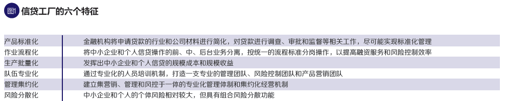 综合来看,信贷工厂具备以下六个特征:产品标准化、作业流程化、生产批量化、队伍专业化、管理集约化、风险分散化。