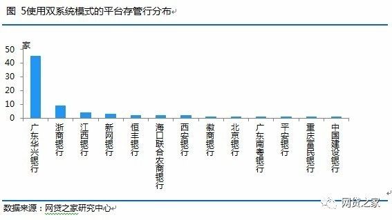 其次是浙商银行,有9家;江西银行有3家平台使用双系统并行模式,其余平台分别有1-3家。(如需查询双系统平台名单,可以在网贷之家微信公众号输入“双系统”或击阅读原文查看名单)