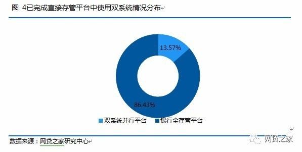 据网贷之家研究中心不完全统计,在完成银行直接存管系统对接并上线的538家平台中,其中有73家平台采用的是第三方支付系统与银行存管系统并存模式(不包括虽是双系统并存,但老平台已不发新标,仅供进行原有交易明细查询及提现申请),占总完成直接存管对接平台数的13.57%。