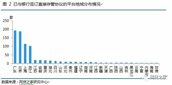 这四个地区签订直接存管协议的平台数排全国前四,占全国已签订直接存管协议平台总数的76.94%。这四个地区的P2P网贷平台数量较多且经济较发达,并有地方性银行如广东华兴银行、上海银行和浙江民泰商业银行涉足P2P网贷平台直接存管业务。