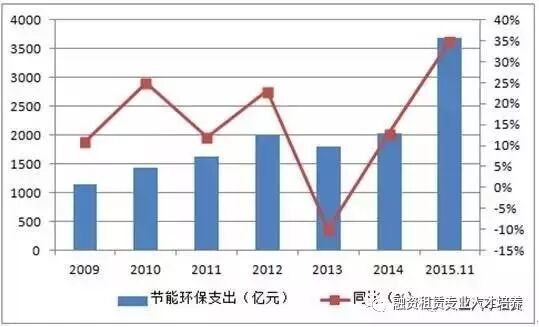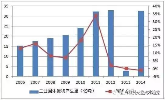 来源:融资租赁专业人才培养2015年我国环境污染治理投资为3692亿元,同比增加35%。全国工业固体废物产生量从2006年的15.2亿吨增长到2014年的32.6亿吨;根