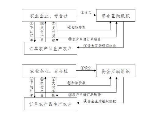 一般运行模式为:订单农产品生产组织者(农业企业、专合社)组织设立资金互助组织,农户加入资金互助组织成为社员,在订单农产品生产过程中可以向资金互助组织申请贷款,用于购买生产资料,在订单农产品收获并交付销售以后,在货款中直接扣除贷款,剩余款项再支付给农户,贷款全程封闭运行。
