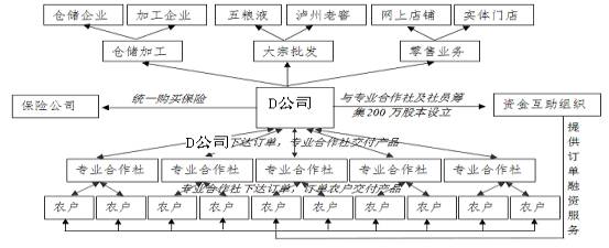 D公司注册资本1000万元,通过关联方式控制五个专业合作社(专业合作社负责人均为D公司股东),以“公司+专业合作社+基地+农户”模式组织订单农业生产。2016年订单农业面积达10274亩,参与农户3219户。