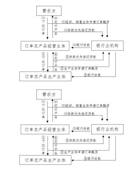 一般运行模式为:生产经营主体获得农产品订单,以订单为依据提出贷款申请,银行对农产品订单进行审核并发放贷款,生产经营主体组织订单农产品生产,订单农产品交付后以货款优先偿还贷款。