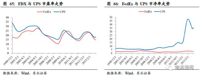 从市净率看,1999年至今,UPS历史平均市净率为13倍,而FedEx仅3倍,目前两家公司PB分别为36倍和3倍,UPS市净率高的主要原因一方面是由于其每年分红率较高,近年分红率均超过50%,而FedEx分红率不到20%;另一方面,UPS飞机超过一半为租赁,FedEx 的飞机全为自有,后者净资产更高。