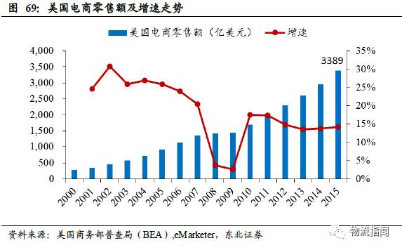 前文已经分析,中国网络购物市场的爆发增长给快递业带来了巨额的增量需求,是带动中国快递业迅猛发展的主要推动力。 反观美国,电商零售额虽然增长也较快,根据eMarketer数据,2015年美国电商零售规模预计达3389亿美元(中国网购规模约5900亿美元),2000-2015年复合增速为18.2%,然而网购市场的兴起并未带动美国快递业务量与收入的快速增长,2000-2015年,美国本土两大快递巨头UPS和FedEx的快递业务量复合增速仅分别为2.0%和1.6%,总营收复合增速为4.6%和6.6%,明显低于中国快递市场30%以上的规模增速,表明美国快递业受益于网购的程度较小。
