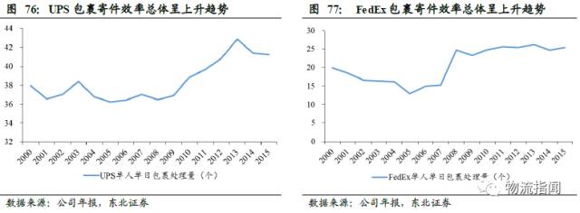 在信息化方面,UPS与FedEx不断地提升自身的信息技术能力,不断地为满足客户日益增长的对信息的需求而努力研发。两家公司近年在信息技术方面一直保持在4亿美元左右的高投入,占收入比重约1%,一直都是全球业界信息技术的领跑者。例如,1986年,联邦快递发明了手持的条形码扫描系统,用以记录详细的包裹信息,是最早使用条形码来追踪快件状态的公司。信息技术的投入直接带动了公司运营效率的提升,两家公司单人单日包裹处理量呈现上升趋势。