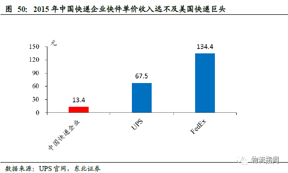美国快递业务量不及中国,但收入规模高的主要原因是快件单价高。2015年,中国快递企业每单快件收入13.4元,仅为UPS的1/5、FedEx的1/10。