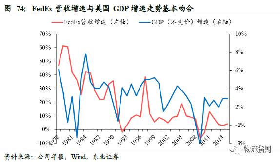 我们通过FedEx营收增速与美国实际GDP增速进行简单的对比,发现二者的走势基本吻合,而实际上国内宏观经济活跃程度决定了国内快递业务需求量水平,这一点与中国类似。