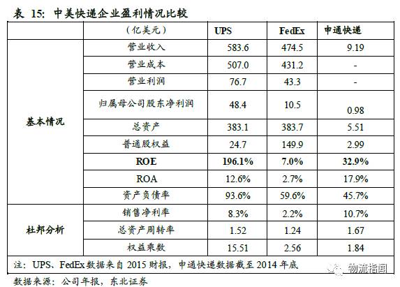 从公司盈利能力来看,UPS的权益报酬率(ROE)远高于同行FedEx,达到196%,后者仅有7%,中国民营快递企业申通的ROE为32.9%,保持在较高水平。