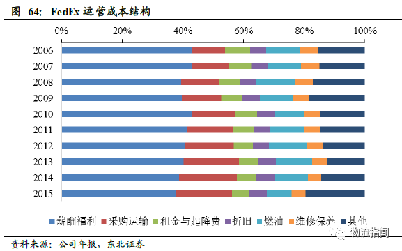 从UPS与FedEx的运营成本结构看,人工成本、采购运输费用以及燃油费用占比较大,三项成本占比超过60%。 其中,2015年,UPS的人工成本支出高达310.3亿美元,占比为61.2%,而FedEx人工成本支出占比为37.5%相对较小,主要原因是UPS员工人数比FedEx高出近12万人,两家公司每年3%-6%的快递业务提价主要是为了应对人力成本的上升。采购运输费用占比UPS与FedEx分别维持在15%和18%左右的水平;目前两家公司所拥有飞机架数超过600架,燃油费也成为公司的一项主要运营成本,受国际油价下跌影响,燃油成本占比呈下降趋势,目前UPS与FedEx燃油成本占比分别为5%和8%。