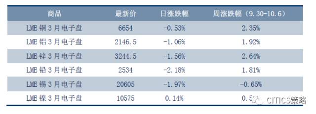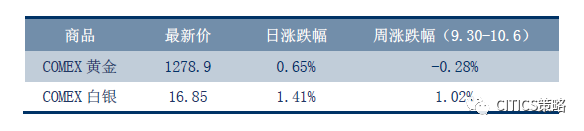 本周贵金属走势分化。周五(10.6)COMEX黄金上涨0.65%,收于1278.9美元/盎司,周跌幅0.28%。COMEX白银上涨1.41%,收于16.85美元/盎司,周涨幅1.02%。