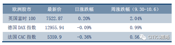 本周欧洲三大股指普涨,但是周五(10.6)涨跌互现,英国富时100指数收涨0.2%,报7522.87点,周涨2.04%,创2017年迄今最大单周涨幅。法国CAC指数收跌0.36%,报5359.90点,周涨0.56%;德国DAX指数收跌0.09%,报12955.94点,周涨0.99%。