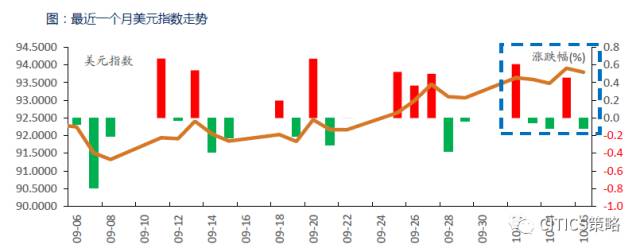周五(美东时间)美元指数小幅下跌,日内稍早出炉的美国9月非农就业报告显示,就业人数意外减少3.3万,但薪资和失业率表现靓丽,美元飙升。但俄国家杜马议员访问朝鲜后表示,平壤决心继续进行导弹试验,有关各方必须及早干预。消息传来之后,美元指数则回吐了非农之后的全部涨幅转而下滑,收于93.7978,日跌幅0.12%。但是综合来看,本周受强劲经济数据支撑和年底美联储加息预期的影响,美元指数仍然实现了连续第四周上涨,周涨幅0.78%。