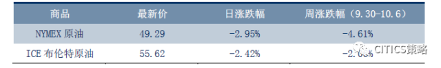 本周原油价格下跌。周五(10.6),美国WTI原油11月期货跌2.95%,收49.29美元/桶,创9月中旬以来最低收盘价,本周累计下跌4.61%; ICE布伦特原油12月期货跌2.42%,收55.62美元/桶,本周跌2.06%,结束五周连升,因供应过剩忧虑重新浮现。