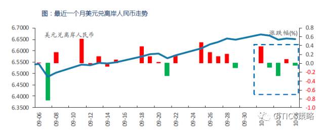 国庆假期在岸人民币未开市,离岸人民币震荡微跌。周一(10.2),离岸人民币微跌0.38%,收于6.6730;周二(10.3)扭跌回升涨0.08%,收于6.667;周三(10.4)继续上涨0.2895%,收于6.6477;周四(10.5)微跌0.098%,收于6.6542;周五(10.6)再次逆转回升,涨0.045%,收于6.6512。本周美元兑离岸人民币整体微跌0.05%。