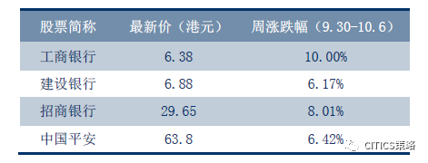 受定向降准刺激,内银、内保本周表现亮眼,其中:工行大涨10.00%,报6.38港元;建行涨6.17%,报6.88港元;招行亦涨8.01%,报29.65港元;中国平安涨6.42%,报63.8港元。