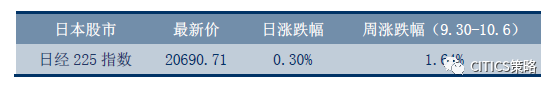 日经225指数本周持续上涨,10月6日(周五)收盘涨0.30%,报20690.71点,周涨幅1.64%。一方面,美国近期发布的经济数据向好,隔夜美股持续上涨,受此影响,东京股市连日攀升。另一方面,美国旧金山联邦储备银行行长Williams在5日表示支持美联储年内再次加息,美国加息预期上升,日美利差扩大的预期使得日元继续小幅贬值,进一步支撑东京股市走高。
