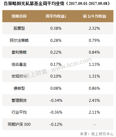 三、阳光私募周度业绩表现:各策略整体表现不佳,表现最好的股票策略周度平均收益仅0.38%