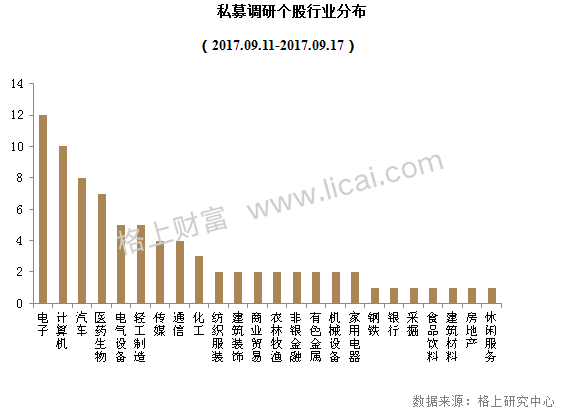 本周私募机构对于板块的关注度依旧分化,中小板关注度最高为45%,中小板已经连续5周得到最高关注,而对创业板关注度为37.5%,主板的关注度继续下降跌至17.5%。行业方面,本周私募机构对于行业的关注度主要集中在电子、计算机、汽车行业。汽车行业是半年以来首次进入前三,格上研究中心发现,近期汽车行业市场关注度逐渐提升,景林资产、鸿道投资、观富资产等投资机构都表示看好。