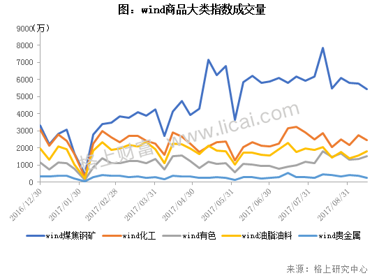 在商品价格走高的同时,部分品种的成交量也在不断攀升。其中,煤炭钢矿的成交量在8月11日当周创年内新高,有色板块6月以来的成交量也较前几个月也所上升。