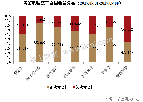 从各策略的业绩表现来看,上周(2017. 09.01-2017.09.08)除管理期货策略外,其余策略均取得周度正收益,但整体收益水平并不高,行业平均收益为-0.36%,收益居首位的股票策略上周周度收益仅有0.38%,阿尔法策略其次。值得注意的是,上周阿尔法策略的正收益占比最高,达85.02%。