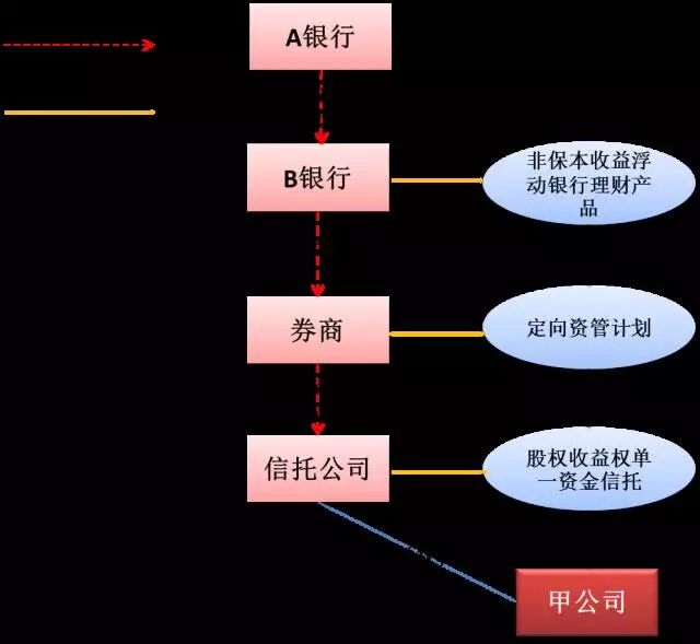 A 银行:形式上投资,实际上贷款;B 银行:形式上理财,实际上过桥;券商:形式上资产管理,实际上过桥;信托公司:形式上信托,实际上过桥;甲公司:形式上使用信托资金,实际上使用银行资金。
