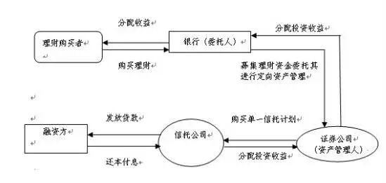 在此模式下,投资人经认购银行理财产品汇入理财资金,理财资金再购买证券公司发起的集合资管计划或定向资管计划,用来购买标准化的银行间市场和证券交易所的债权类资产。此模式无监管禁止。