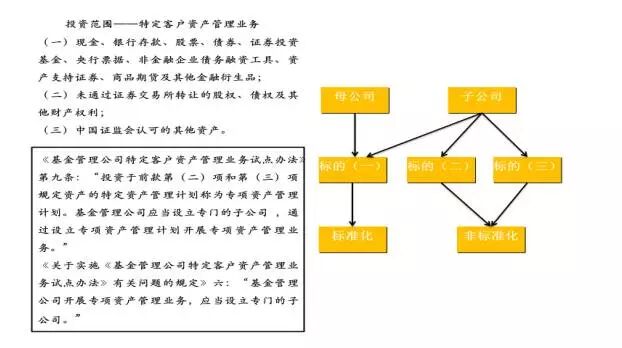 针对多个或单个客户的特殊要求和基础资产的具体情况,设定特定投资目标,通过专门账户为客户提供资产管理服务。主要是企业资产证券化业务,是进行其他业务类型的一个通道和平台,如高速公路、水利发电、租赁资产等创新型产品。
