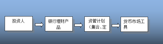 在此模式下,投资人经认购银行理财产品汇入理财资金,理财资金再购买证券公司发起的集合资管计划或定向资管计划,用来购买流动性高,风险小的货币市场工具。此模式无监管禁止。