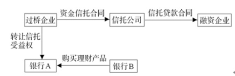 过桥企业与信托公司签订《资金信托合同》,委托信托公司向融资企业发放信托贷款,过桥企业获得信托受益权;过桥企业将信托受益权转让给银行 A,A 将该信托受益权包装成保本型理财产品;银行 B 与银行 A 签订《资产管理协议》,购买银行 A 发行的上述保本理财产品。
