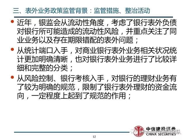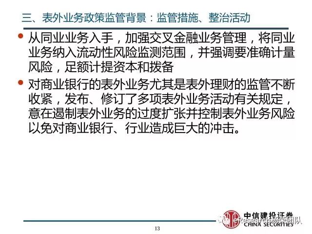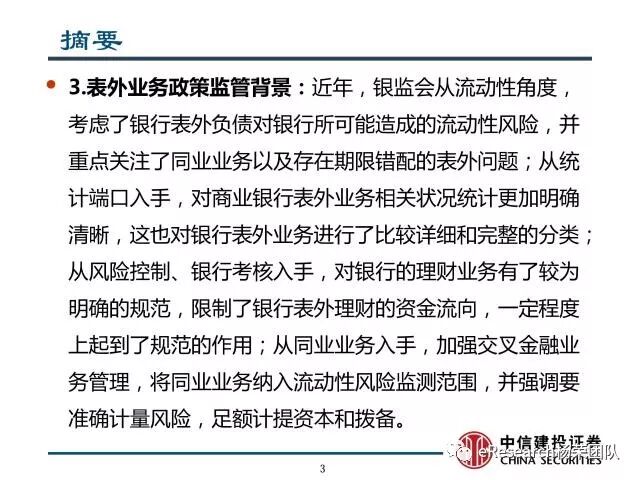 3、表外业务政策监管背景:近年,银监会从流动性角度,考虑了银行表外负债对银行所可能造成的流动性风险,并重点关注了同业业务以及存在期限错配的表外问题;从统计端口入手,对商业银行表外业务相关状况统计更加明确清晰,这也对银行表外业务进行了比较详细和完整的分类;从风险控制、银行考核入手,对银行的理财业务有了较为明确的规范,限制了银行表外理财的资金流向,一定程度上起到了规范的作用;从同业业务入手,加强交叉金融业务管理,将同业业务纳入流动性风险监测范围,并强调要准确计量风险,足额计提资本和拨备。对商业银行的表外业务尤其是表外理财的监管不断收紧,发布、修订了多项表外业务活动有关规定,意在遏制表外业务的过度扩张并控制表外业务风险以免对商业银行、行业造成巨大的冲击。