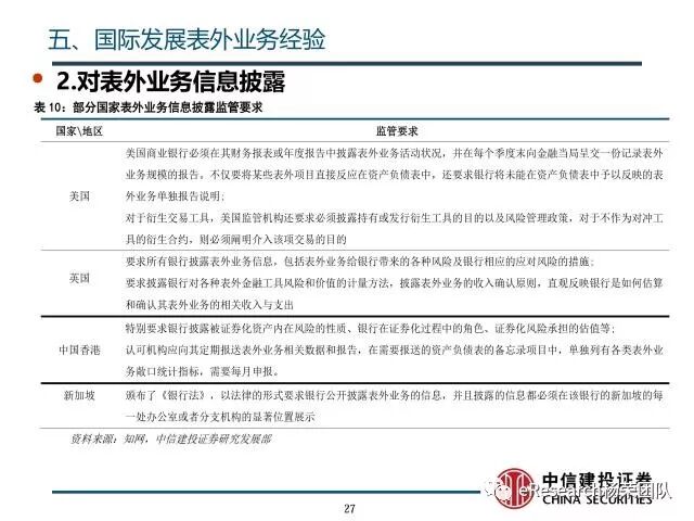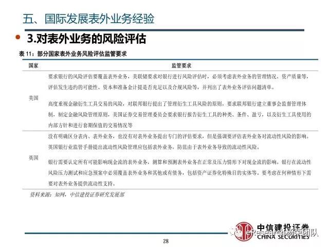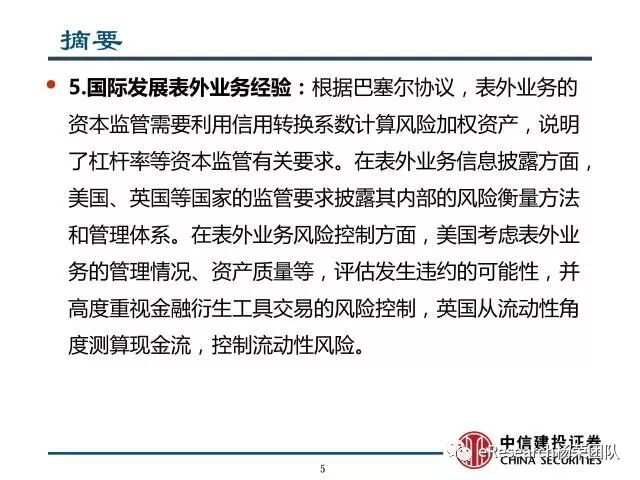 5、国际发展表外业务经验:根据巴塞尔协议,表外业务的资本监管需要利用信用转换系数计算风险加权资产,说明了杠杆率等资本监管有关要求。在表外业务信息披露方面,美国、英国等国家的监管要求披露其内部的风险衡量方法和管理体系。在表外业务风险控制方面,美国考虑表外业务的管理情况、资产质量等,评估发生违约的可能性,并高度重视金融衍生工具交易的风险控制,英国从流动性角度测算现金流,控制流动性风险。